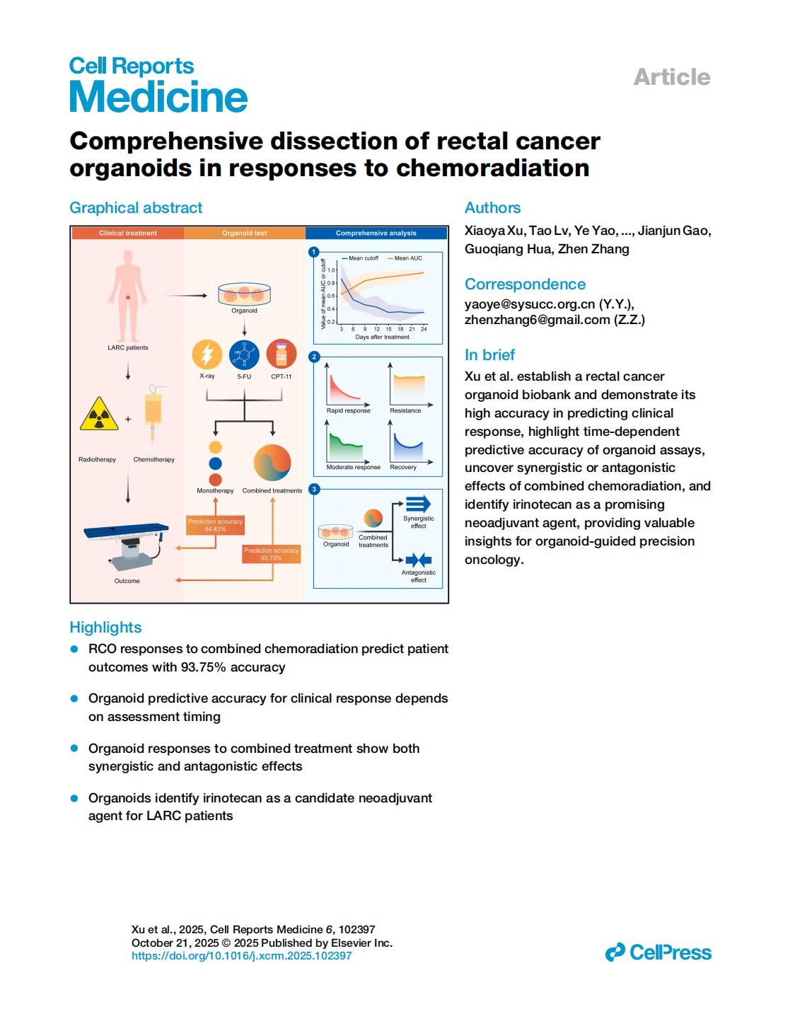 2025年10月3日,复旦大学附属肿瘤医院章真教授、华国强研究员(丹望医疗创始人),及中山大学肿瘤防治中心姚晔等人在Cell子刊Cell Reports Medicine(IF:11.7)上发表了题为:Comprehensive dissection of rectal cancer organoids in responses to chemoradiation 的研究成果,揭示直肠癌患者来源类器官(RCO)模型对联合放化疗的反应可实现对临床治疗结局的高效预测,准确率突破93.75%,并鉴定出伊立替康可作为局部晚期直肠癌(LARC)患者新辅助治疗的候选药物,为局部晚期直肠癌(LARC)的个体化治疗方案制定提供了创新性技术支撑。
